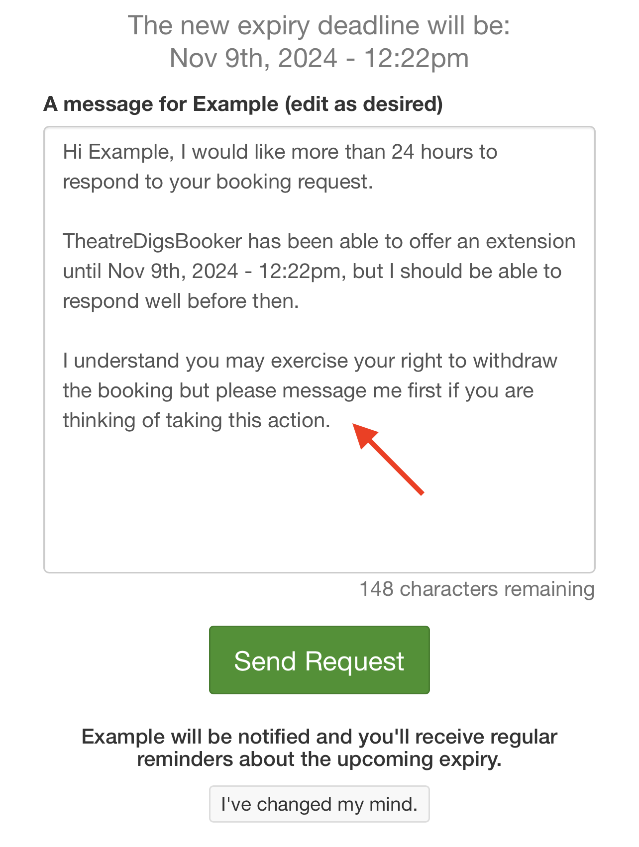 Once your request has gone through TheatreDigsBooker will send you a confirmation of extension email and will also send a reminder email for each day of the extension.