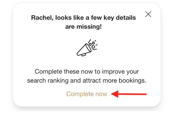 If there is anything on your Digs Listing which would help you improve your search ranking we will remind you each time you go into your Host account and you will see this pop up message: